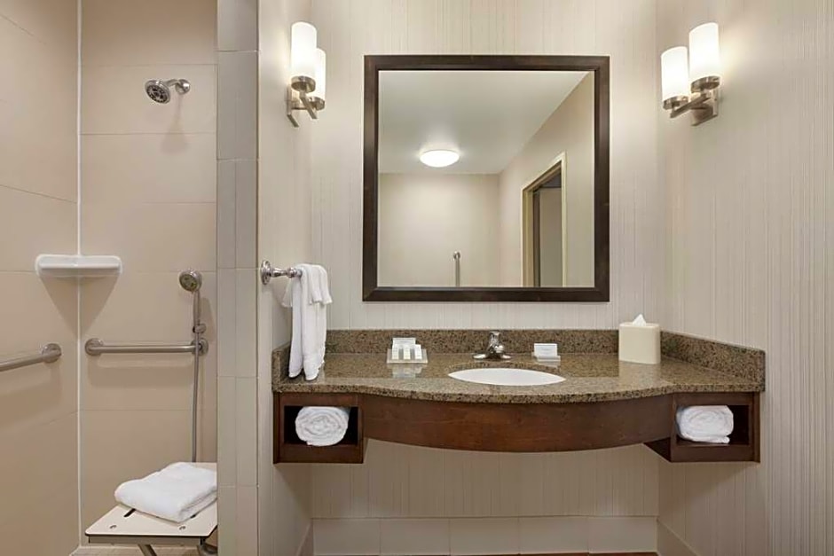 This mobility accessible standard room features a roll-in shower with attached accessible seating, lowered vanity in bathroom, and lowered shelf in closet. This room also offers the latest in technology and ergonomic comfort to our guests. The ergonomic chair is good for your back and better for work. Enjoy an in-room movie or your favorite television show on our 32-inch HDTV. There is also a microwave, refrigerator and coffee/tea maker to help you feel at home. And for conducting business, our rooms ensure your productivity thanks to the spacious work desk and complimentary WiFi access. Any corresponding photo may not reflect the specific accessible room type or room feature.