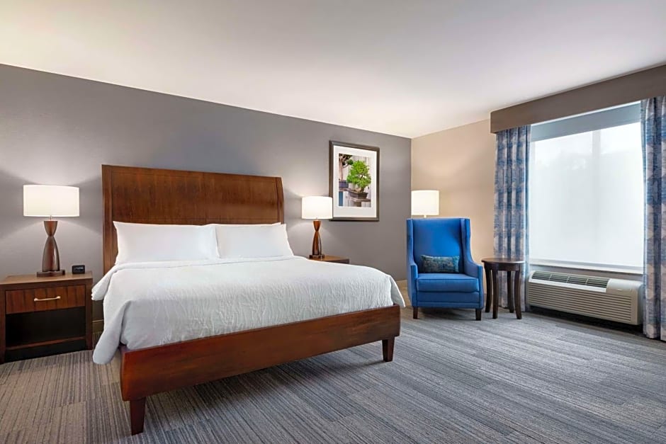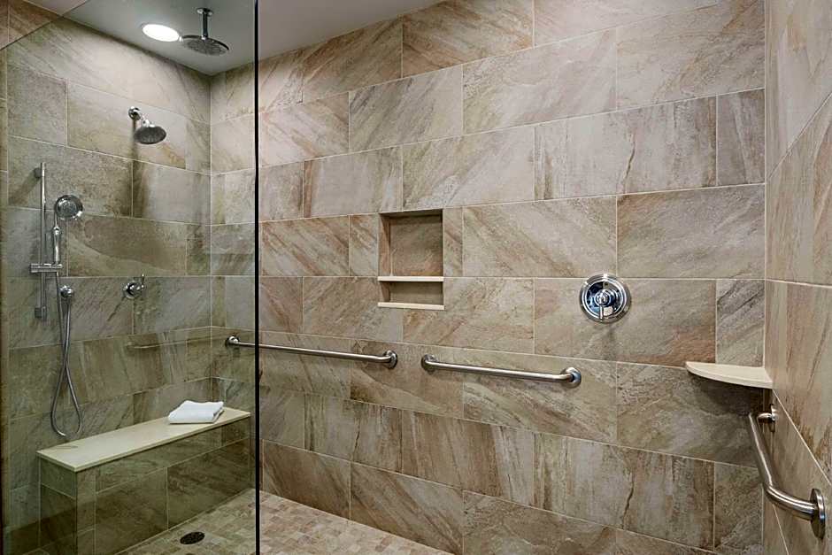 This mobility and hearing accessible standard room features one king-sized bed and a roll-in shower with attached accessible seating, lowered vanity in bathroom, lowered closet shelf, visual alarm, and notification devices for the doorbell or door knock and incoming telephone calls. Enjoy your favorite television show on our 32-inch HDTV. The ergonomic chair is good for your back and better for work. There is also a microwave, refrigerator and coffee/tea maker to help you feel at home. And for conducting business, our rooms ensure your productivity thanks to the spacious work desk, two telephones with dataport and voicemail and complimentary WiFi access. Any corresponding photo may not reflect the specific accessible room type or room feature.
